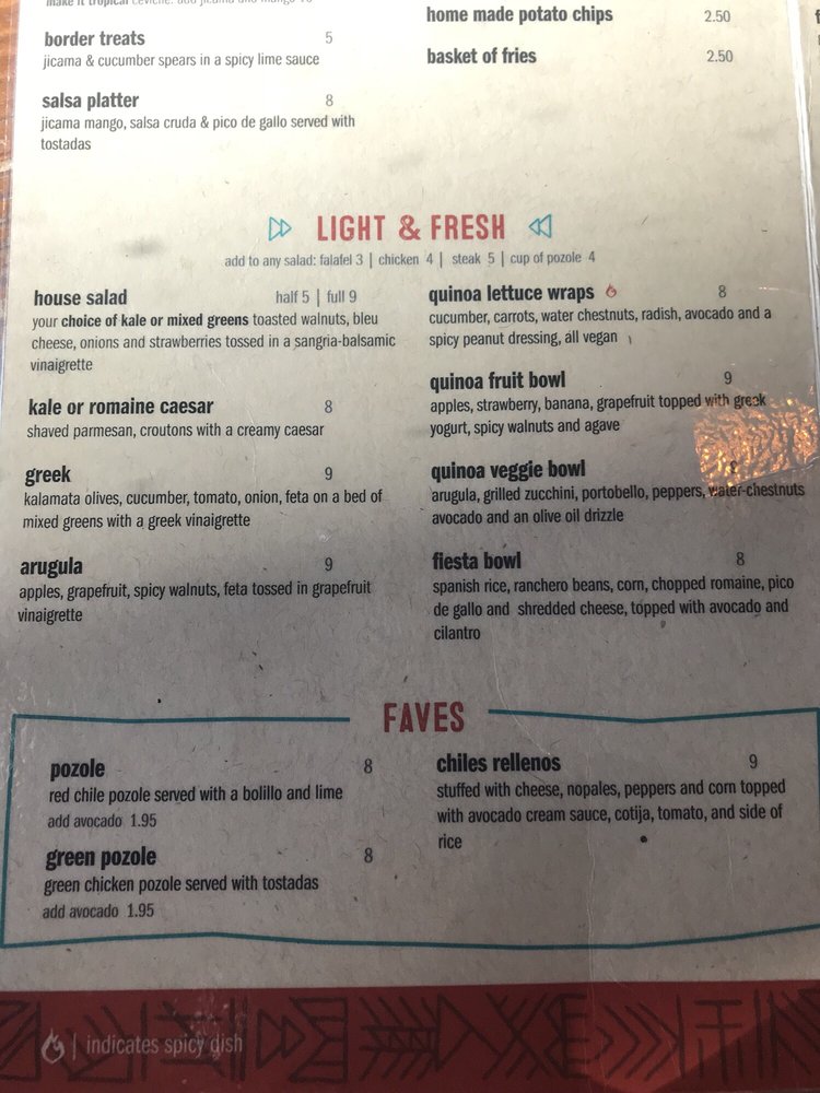 Beans, jalapeno, cheese, tomato, cilantro. Add protein for an additional charge.